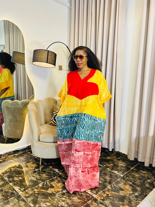 Temi – Color Block African Boubou Dress | Hand-Dyed Adire Patchwork Kaftan