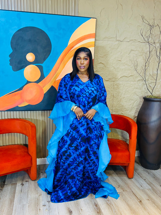 Jamila – Ruffle Sleeve African Boubou Dress | Luxury Adire Kaftan for Women
